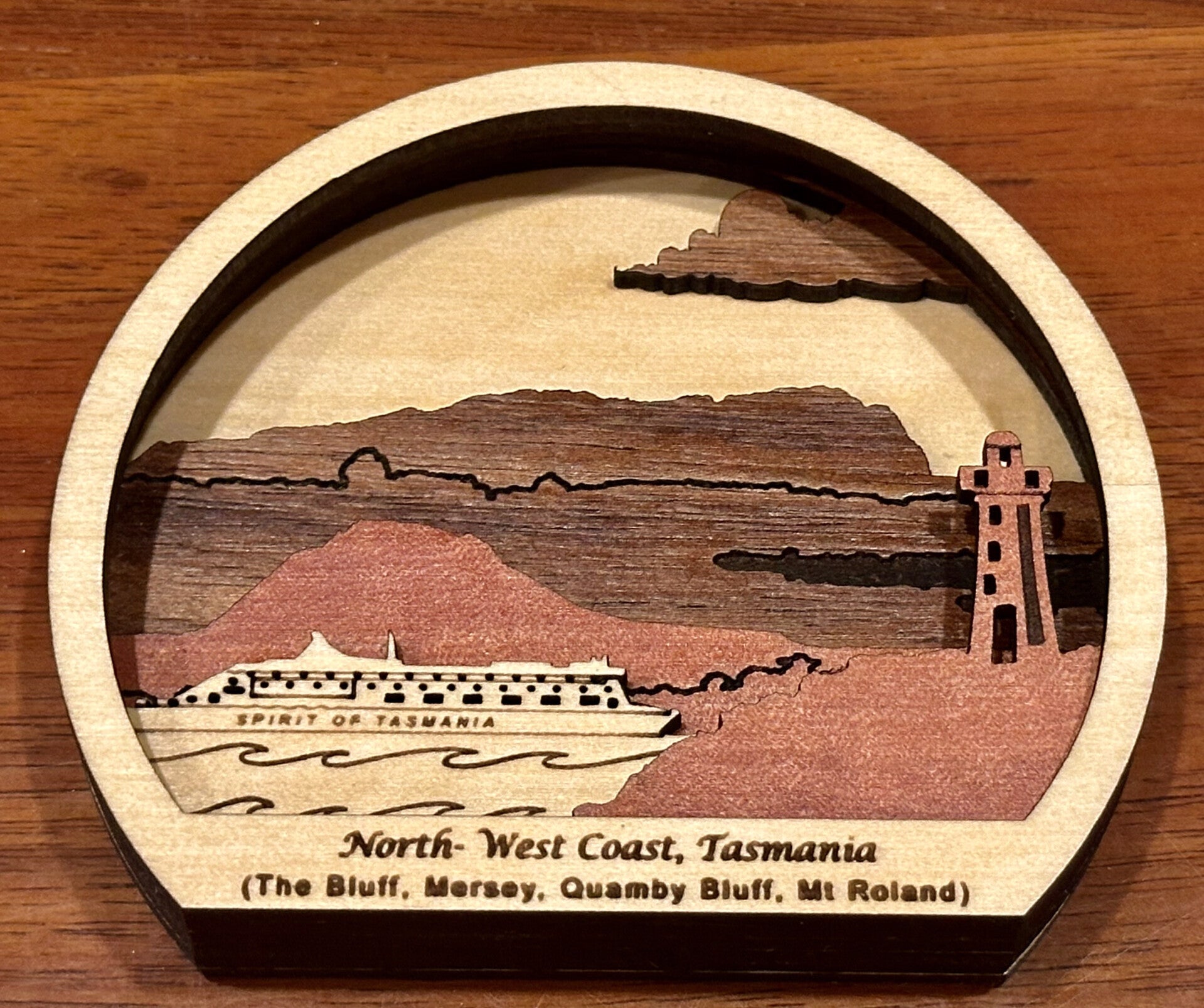 Devonport Diorama featuring Mersey Bluff, Quamby Bluff, Mount Roland, Lighthouse, Spirit of Tasmania made of 6 layers of Tasmanian Timbers: Blackwood, Golden Sassafras and Myrtle, 200mm high.