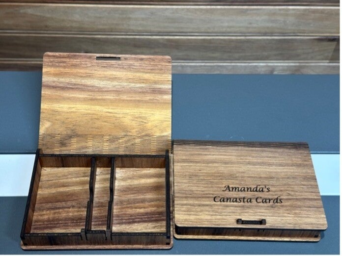 Holds 2 packs of playing cards with a flexible spine, made from Blackwood, Mrytle or Golden Sassafras. Customised laser engraving on the front cover on request.