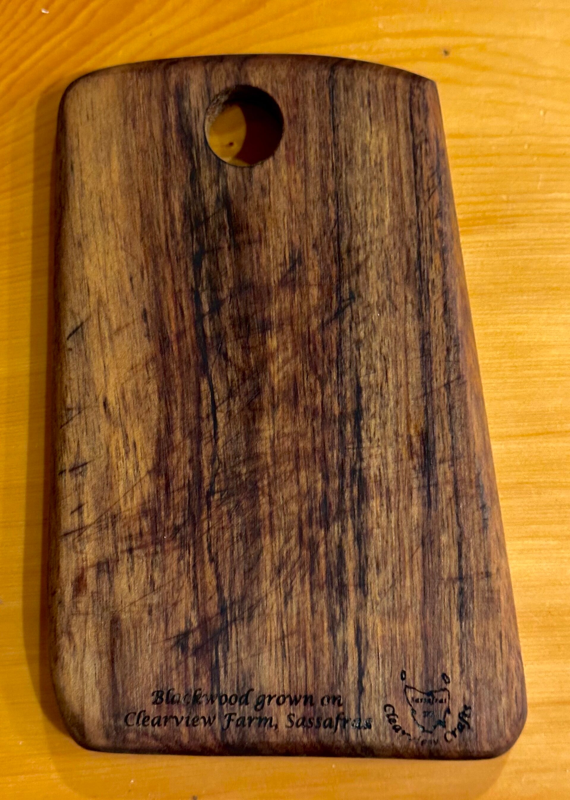 Custom made Blackwood Chopping Boards with sizes to suit and laser engraving as required, made from Blackwood Trees planted 20-35 years ago on our Clearview Farm, with beautiful dark grain features. Prices from $20 - $85 depending on size