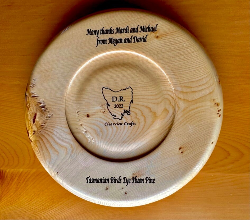 Customised bowls and plates of different sizes, shapes and timbers with options of Huon Pine, Celery Top Pine and Blackheart Sassafras. Prices depending upon the timber and size, range from $15 - $150.