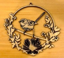 Three designs of Laser Cut Window Charms featuring Tasmanian Blue Wrens, available in different Tasmaina Timber Veneers: Blackwood, Golden Sassafras and Myrtle with the option of Huon Pine or Blackheart Sassafras in solid timber.
